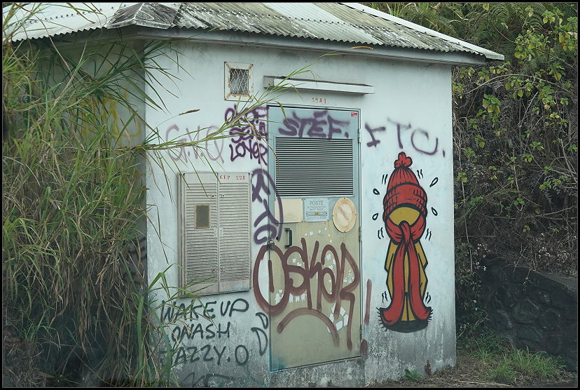 Auf der Rückfahrt entdeckten wir wieder die kleinen gelben Männchen, die uns auf La Réunion schon an den ersten Tagen mehrfach aufgefallen sind. Die Figuren stammen vom lokalen Street-Art-Künstler Jace und heißen Gouzou. Mit leisem Humor kommentieren sie den ganz normalen Alltag auf der Insel – mal Arbeit, mal Technik, mal kleine Absurditäten des Lebens. Total niedlich!
