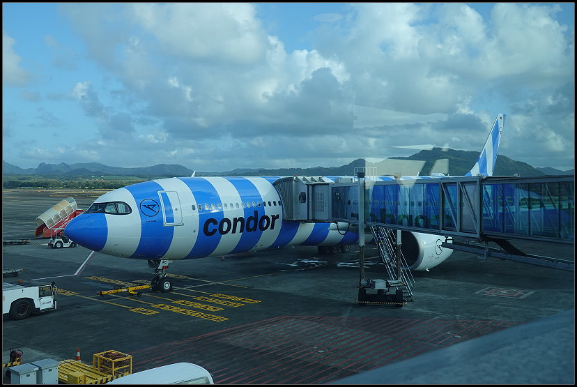 Nach wenigen Minuten erreichten wir um 05:40 Uhr den Flughafen. Vor den Condor-Schaltern warteten bereits unzählige Passagiere… Der Flieger schien ausgebucht zu sein?!
