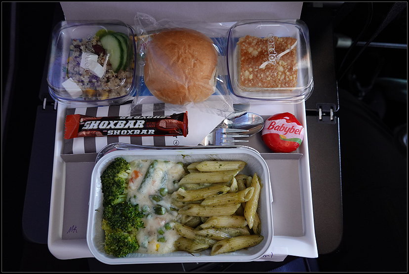 Etwa eine Stunde nach dem Start gab es ein kleines Frühstück. Na ja, das gummiartige Baguette mit Käse war ganz okay, aber der Joghurt und das Obst schmeckten überhaupt nicht. Gut, mit dem Obst waren wir jetzt natürlich auch sehr verwöhnt.