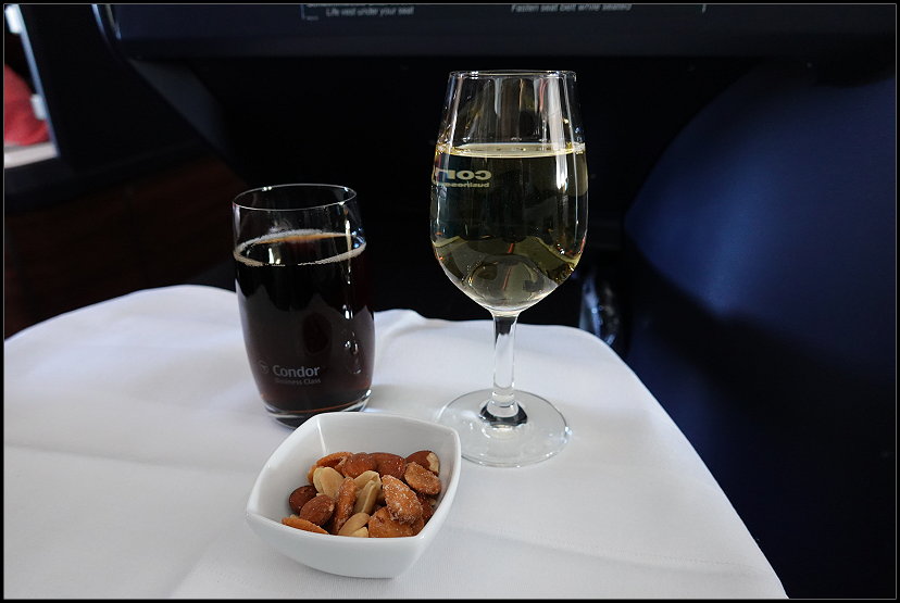 Der Flieger hob dann mit zwanzig Minuten Verspätung um 16:20 Uhr ab. Unsere Plätze Nr. 2 D und G in der Business Class waren grundsätzlich natürlich super, allerdings würde ich sie nicht noch einmal wählen. Zum einen sind es direkte Gangplätze und somit vom Partner „weit“ entfernt. Und zum anderen befinden sich neben diesen Business-Plätzen die extra Premium-Plätze, die auch eine gegenüberliegende Sitzanordnung ermöglichen. Leider machte genau das ein Pärchen und ich fühlte mich die ganze Zeit über total beobachtet. Irgendwie unangenehm…