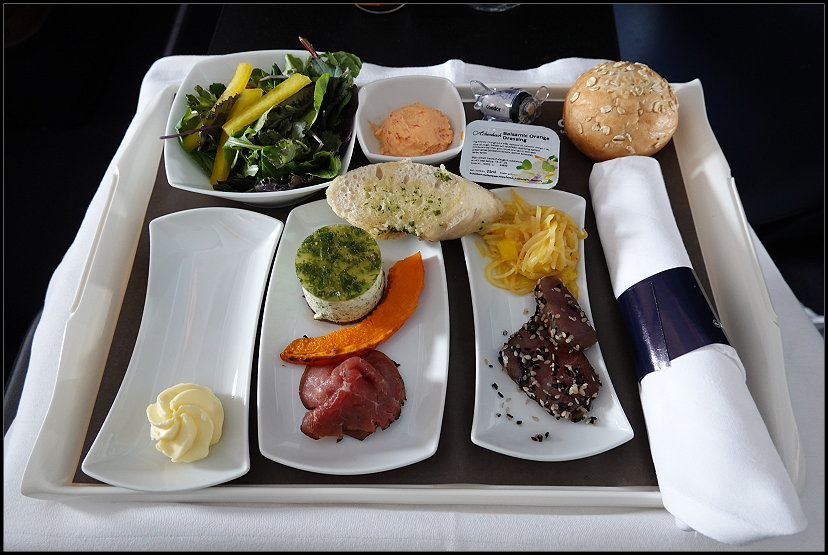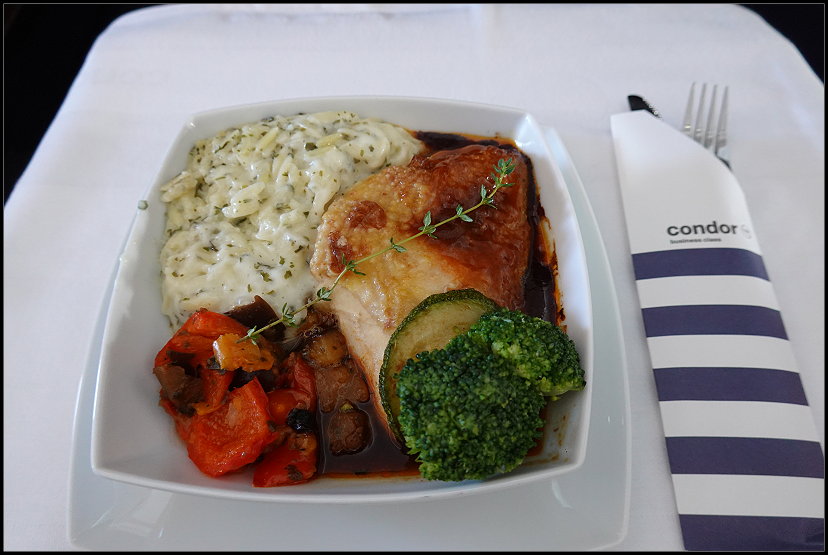 Zwei Stunden nach dem Start gab es bereits Abendessen. Leider war ich noch ziemlich satt vom Essen aus der Lounge. Hätte ich dort doch mal lieber nichts gegessen.