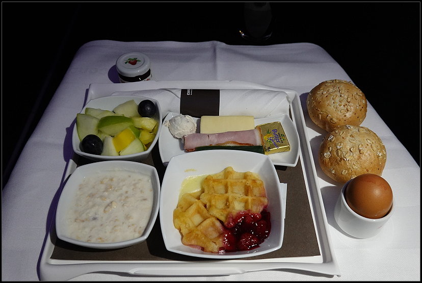 Um 02:20 Uhr wurde langsam wieder die Kabinenbeleuchtung eingeschaltet und dann gab es auch bereits Frühstück. Das war ja gar nicht meine Essenszeit…
