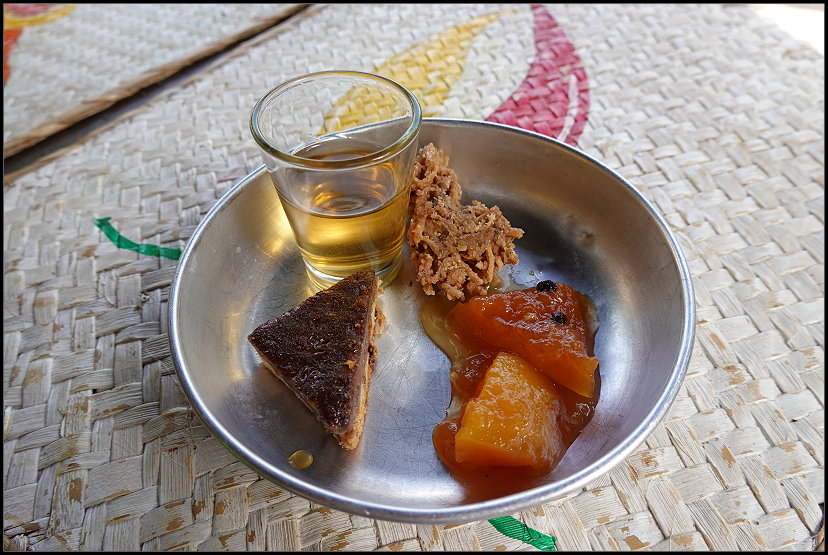 Zum Nachtisch gab es einen Kokoskeks, Bananentarte (voll was für Tom…), Papaya und ein Gläschen Rum. Lecker, lecker, lecker!!! Der zum Cappuccino gereichte Zucker war dunkelbraun und schmeckte total köstlich nach Malz.