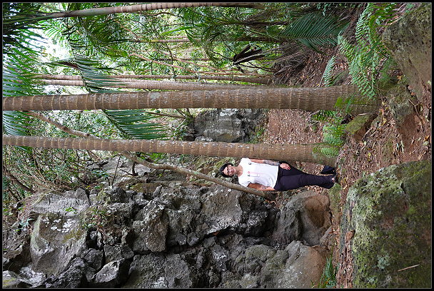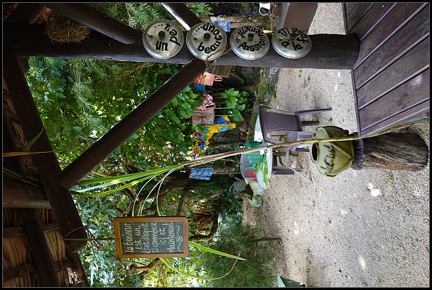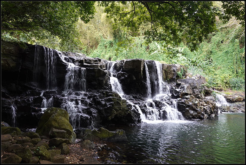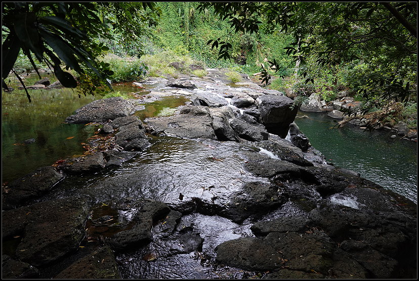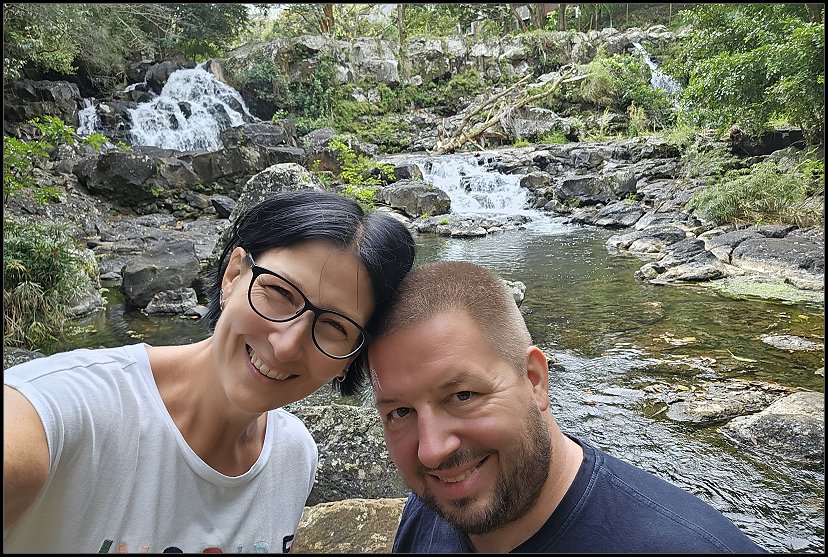 Im angrenzenden Garten gibt es einen kurzen Wanderweg zu ein paar netten Wasserfällen. Schuhtechnisch waren wir mit unseren Schlappen überhaupt nicht passend gekleidet. Uih, schön langsam schlichen wir den steilen Erdweg hinunter.