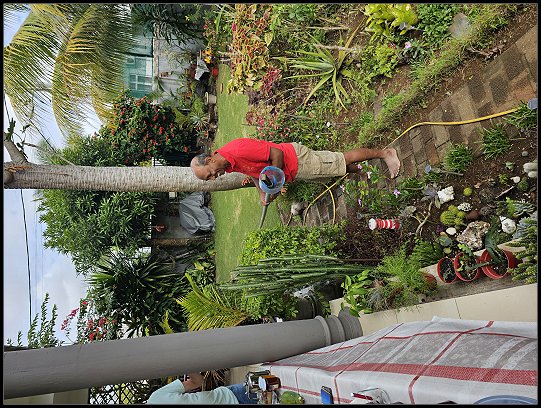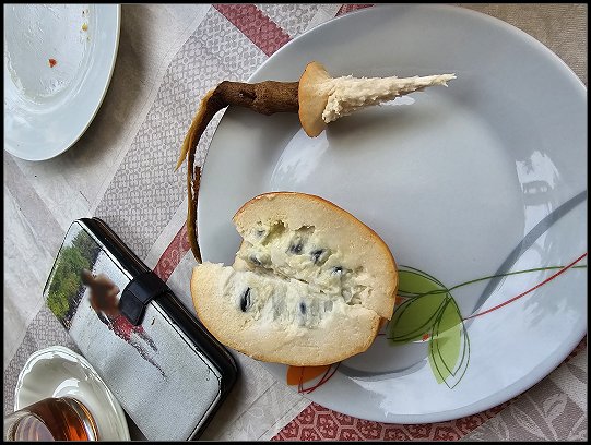 Jay zeigte uns, wie er mit einer selbstgebauten Vorrichtung eine Papaya pflückt und wir durften einen exotischen Rahmapfel, auch Ochsenherz genannt, probieren. Die Frucht ist in den Tropen heimisch und ihr Fruchtfleisch ist cremig und schmeckt wie eine Mischung aus Banane, Mango, Birne und Honigmelone. Seltsam und nicht so recht unser Geschmack.