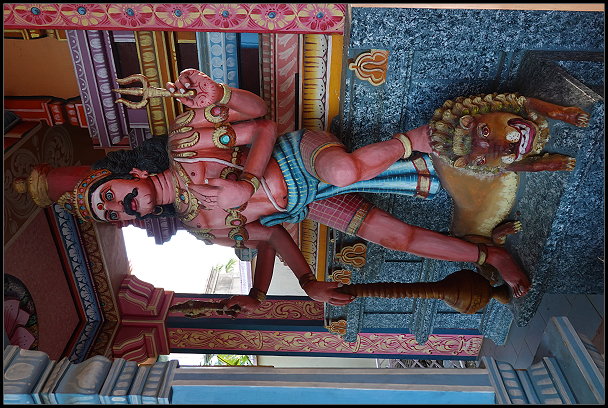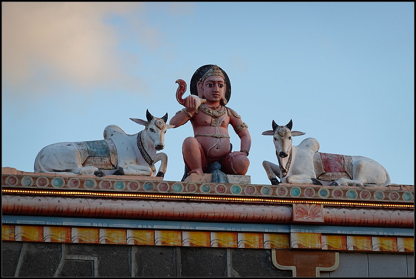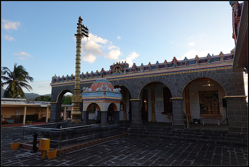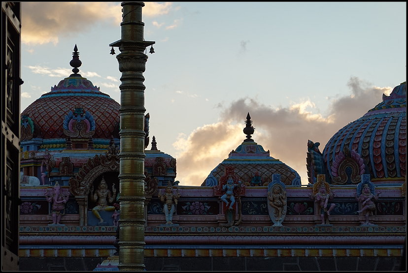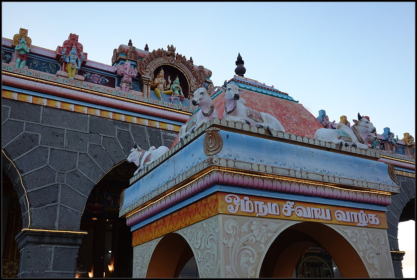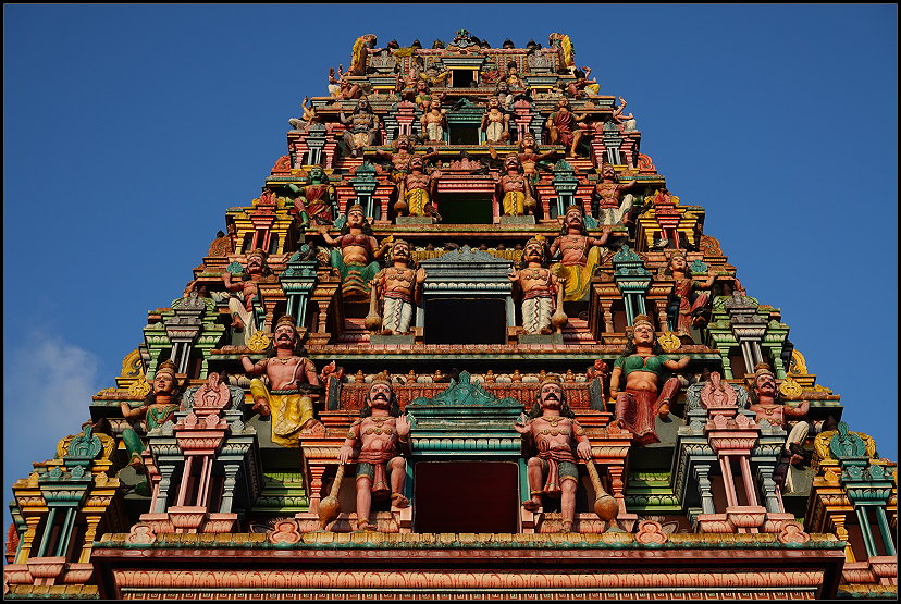 Unseren letzten Stopp legten wir am kunterbunten Hindutempel „Sockalingum Meenatchee Ammen Kovil“ ein. Er ist einer der wichtigsten religiösen Orte auf der Insel. Schuhe ausziehen und die Knie bedecken sind in der Anlage Pflicht. Da Tom leider eine kurze Hose anhatte, begab ich mich alleine auf eine kurze Entdeckungsreise in die hinduistische Kultur.