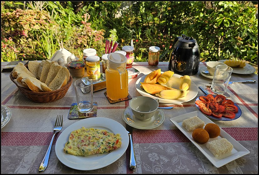 Beim Frühstück bekamen wir erst einmal unser Insektenschutzmittel wieder. Das war mir gestern nämlich vom Balkon gefallen, als ich einen dicken Käfer damit von selbigem schubsen wollte.