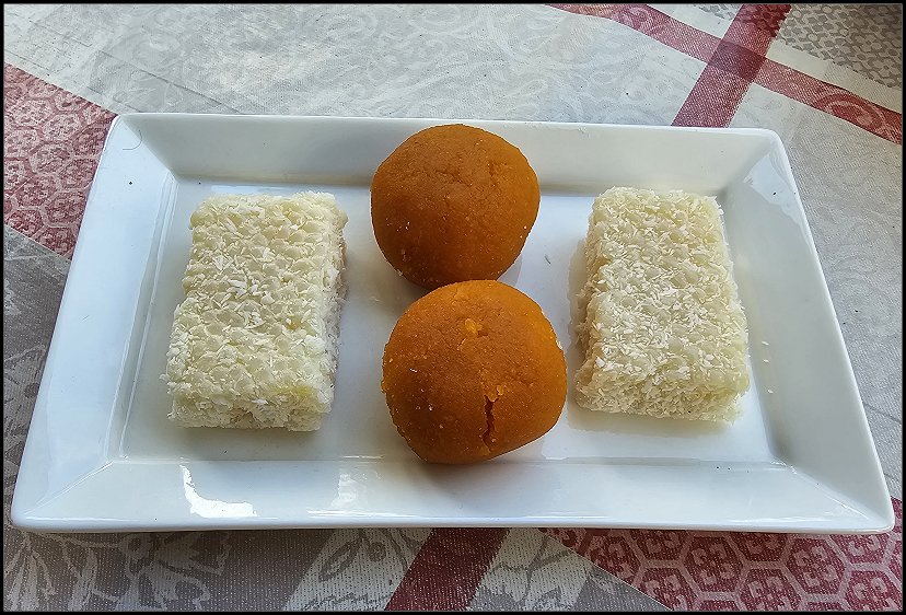 Jay hatte extra für uns Ladoo und Sagoo besorgt. Ladoo ist eine kleine, runde Süßigkeit aus der indischen Küche, die in vielen Variationen und regionalen Rezepten zubereitet wird. Sagoo ist ein beliebtes Dessert, das aus Sago-Perlen, Kokosmilch und Zucker hergestellt wird und ein bisschen wie Milchreis schmeckt. Sago ist eine Stärke, die aus dem Mark von Sago-Palmen gewonnen wird und in Form kleiner, durchsichtiger Kügelchen oder Perlen vorkommt. Sehr leckere, nicht so süße Naschereien.