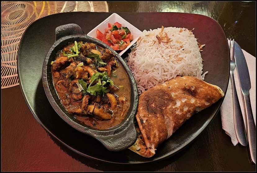 Zum Glück kamen wir unverletzt am leeren Lokal an. Die „Mishmash Cuisine“ (O-Ton der Speisekarte!) war ganz lecker, nur das Naan-Brot war leider total trocken. Schade, denn das esse ich nämlich richtig gerne.