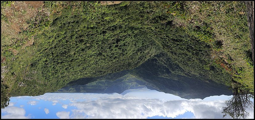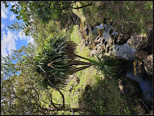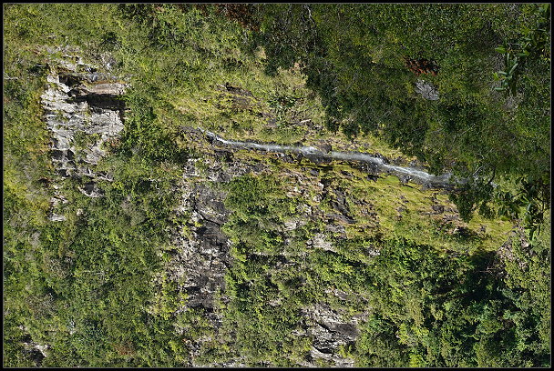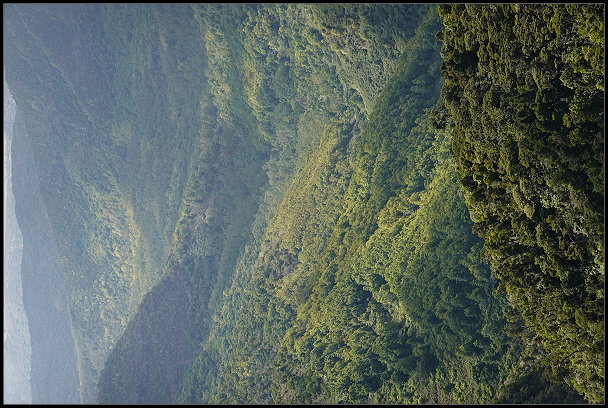 Zu unserer Rechten ein kleiner Wasserfall, vor uns die tiefgrünen Berge und Täler, und am Horizont im Dunst konnten wir sogar das Meer sehen. Dazu das Gezwitscher der Vögel und der warme Wind, der vom Tal heraufwehte … So schön!