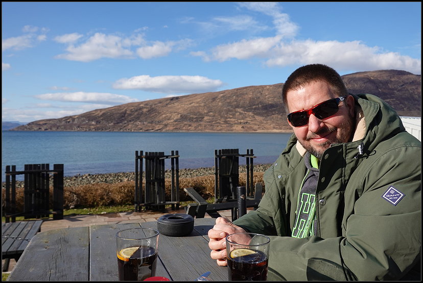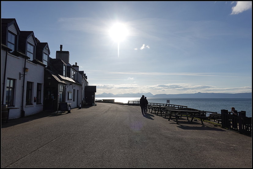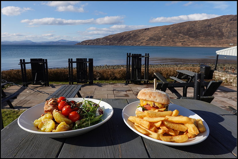Als wir um 14:00 Uhr am Applecross Inn ankamen, setzten wir uns nach draußen und bestellten etwas zu essen. Der Blick von der Terrasse des Gasthauses ist atemberaubend: Vor uns erstreckte sich das ruhige Meer und am Horizont konnten wir die Berge der Inseln Raasay und Skye erkennen.