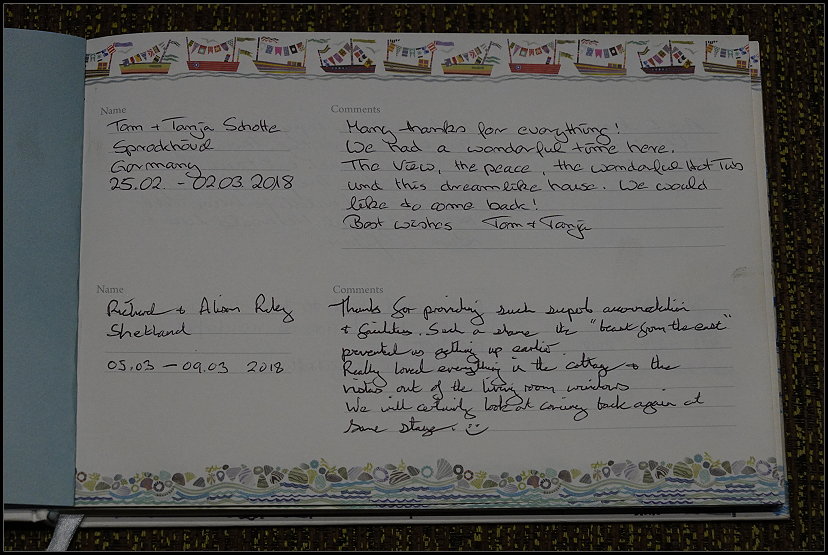 Nach dem Abendessen entspannten wir auf dem gemütlichen grünen Sofa, während Tom sich einen Film anschaute. Ich arbeitete noch am Reisebericht und stellte einige Bilder in den Status. Wenig später stieß ich im Gästebuch auf unseren Eintrag vom ersten Besuch in diesem Cottage. Wie schön!