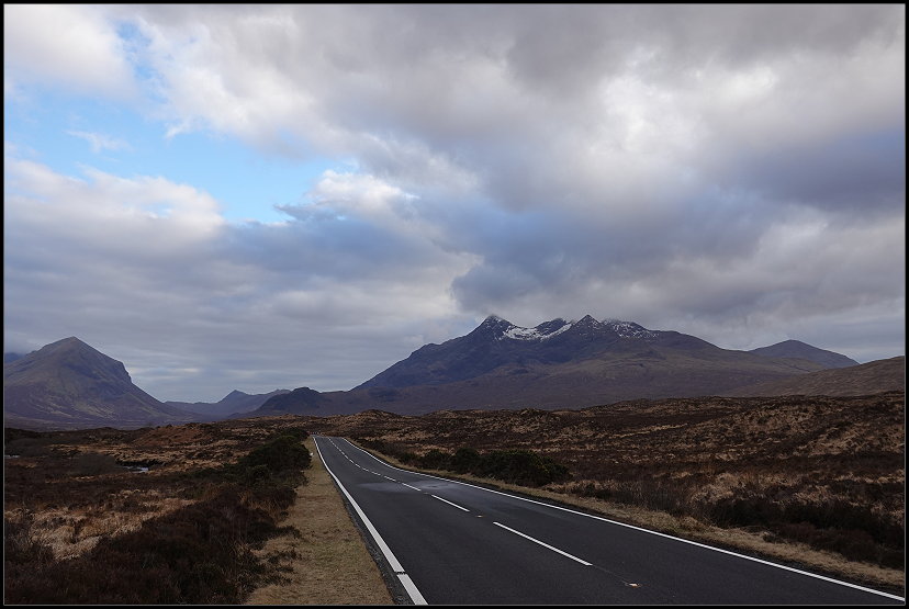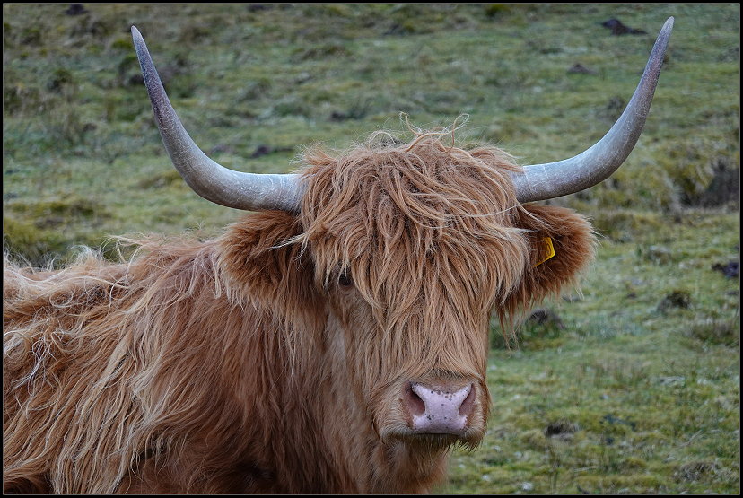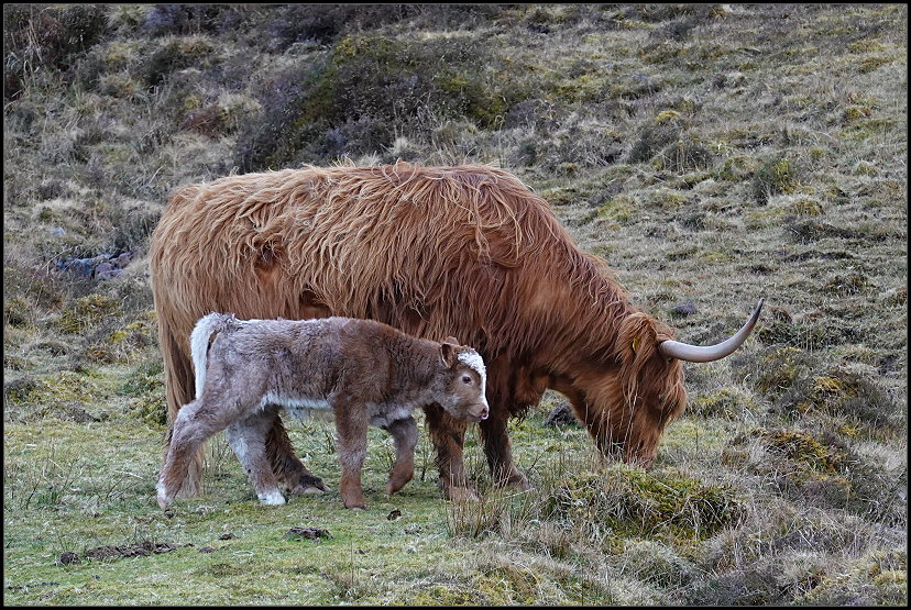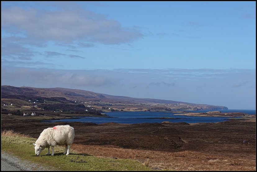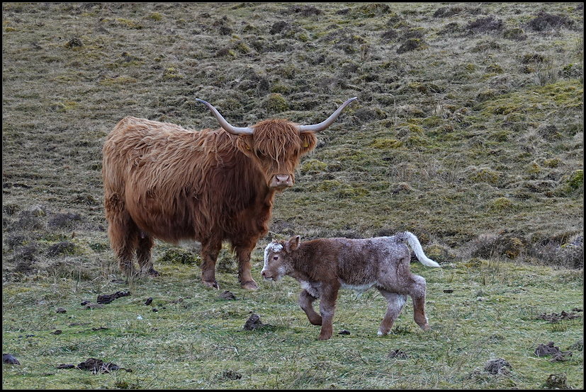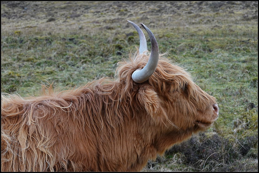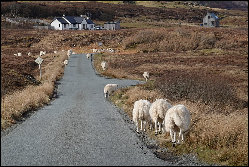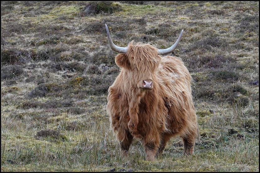 In Sconser kamen wir an der hochangepriesenen Highland Cattle Herde vorbei, die uns die übermotivierte Touri-Info-Mitarbeiterin in Ullapool auf der Karte eingezeichnet hatte. Dort gab es sogar einen Parkplatz und es standen bestimmt 60 Touristen am Zaun und machten Bilder! Und das im März! Wir waren geschockt!
