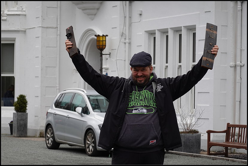 Als wir am Skeabost House Hotel anhielten, um von dort aus zum St. Columba’s Isle Friedhof zu spazieren, sahen wir, dass dort gerade ein kleiner Ostermarkt stattfand. Tom rollte nur mit den Augen, als er meine Begeisterung sah. Aber ratet doch mal, wer dort etwas kaufte? Na? Ich war es nicht! Einen Flaschenöffner für die Wand und eine Garderobe erstand mein liebster Ehemann. Ja, die aus Whiskyfassdauben gefertigten Sachen sind schön. Ich schreib schon nix mehr! *lach*
