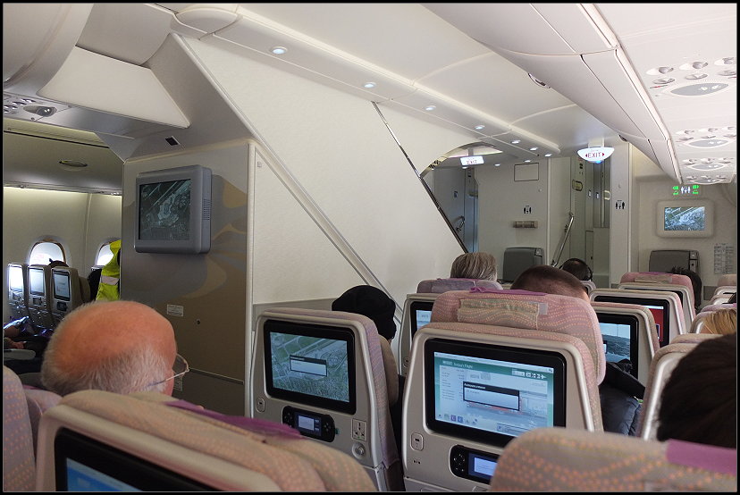 Um 14:40 Uhr hockten wir dann im Flieger, der leider ein wenig enger war als der A380. Bis wir abhoben, dauerte es aber noch bis 15:30 Uhr. Angeblich war wohl viel Verkehr, das kannten wir von Dubai ja.