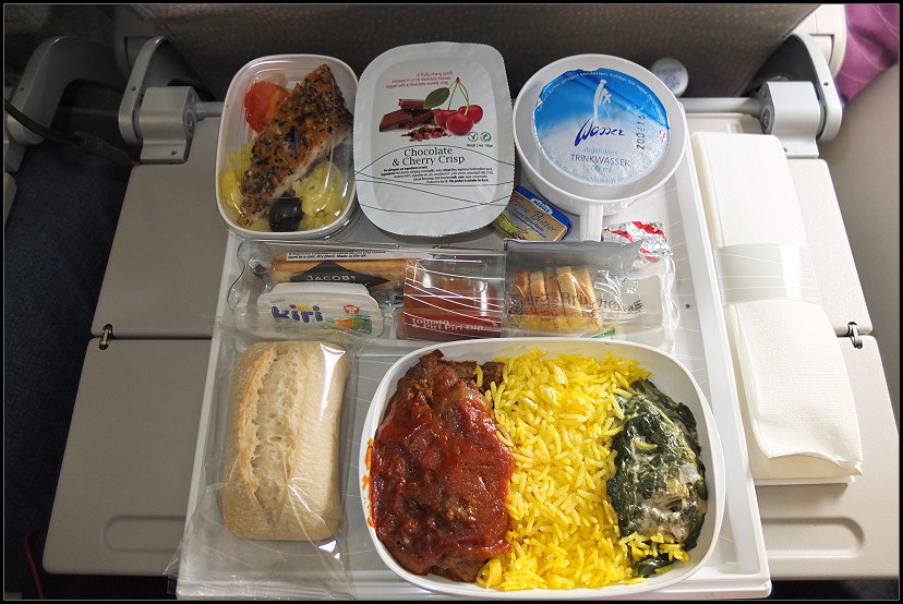 Nach etwas über einer Stunde wurde ein wirklich sehr leckeres Essen serviert. Das Beste, was wir je in der Economy-Klasse gegessen hatten. Tom und ich hatten uns für das Lamm und Mama für das Huhn entschieden. Dazu Makrele auf Kartoffelsalat als Vorspeise und ein Schokotraum als Nachtisch.
