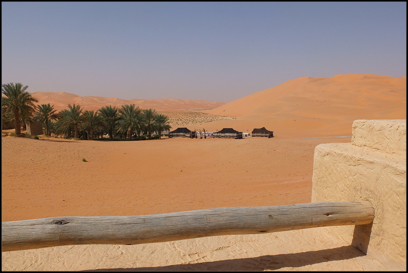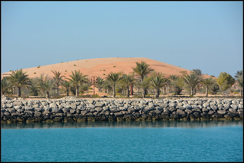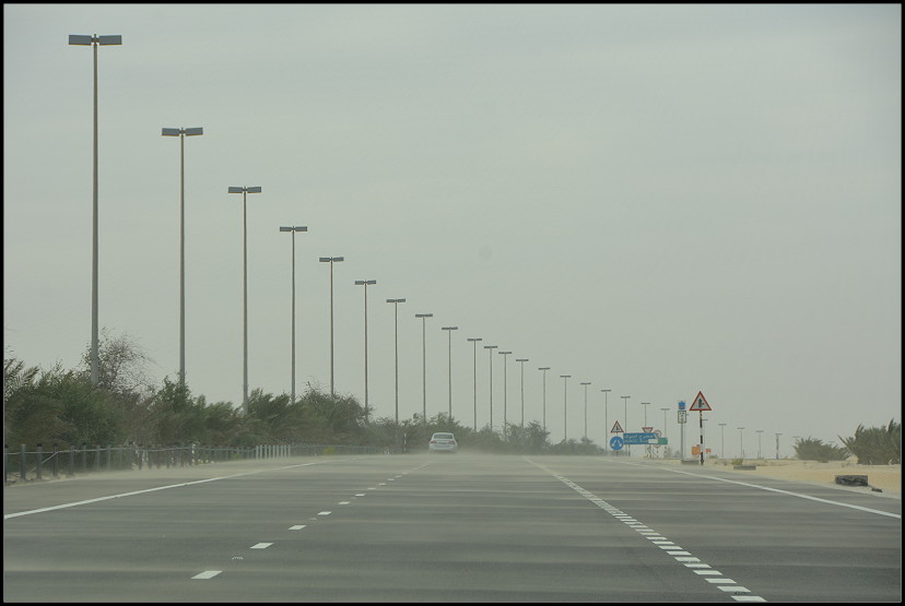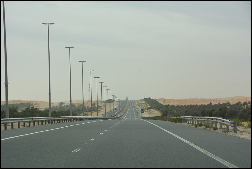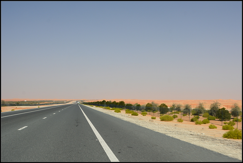Nach wenigen Minuten waren wir durch die Häuseransammlung gefahren und vor uns lag die 60 Kilometer lange schnurgerade Strecke zur Liwa-Oase. Rechts und links neben der Straße hatte man Bäume und Palmen gepflanzt, die mit schwarzen Schläuchen bewässert werden. Außerdem gibt es einen hohen Zaun, der die wildlebenden Kamele vor den Autos schützen soll. Das war es dann auch schon, was es zu sehen gab.