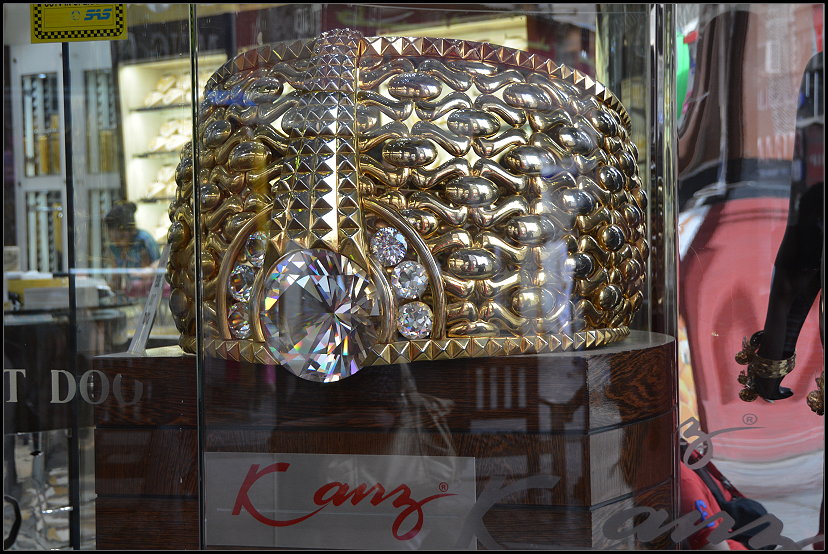 Und natürlich den Gold Souk, in dem wirklich alles Gold ist, was glänzt. Die unzähligen Auslagen in den kleinen Geschäften funkelten und blendeten uns regelrecht. Was für ein unschätzbarer Wert dort wohl lagert? Direkt zu Anfang konnten wir in einem Schaufenster den größten und schwersten Goldring der Welt bestaunen. Er wiegt fast 64 Kilogramm und hat einen Umfang von 2,20 Metern.