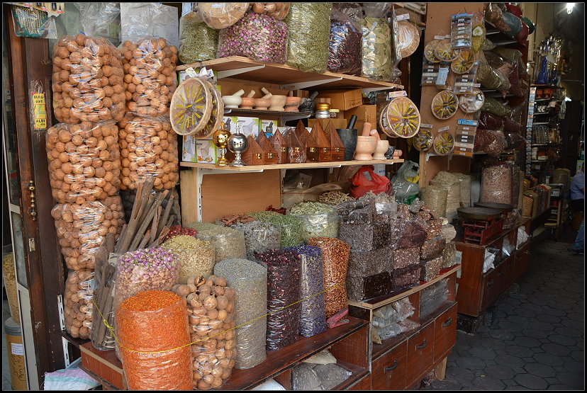 Und leider wurde es im Gewürz-Souk nicht besser. Wir hatten dann einfach keine Lust stehen zu bleiben und uns umzusehen. Dabei gefiel es uns dort sonst sehr gut. In den engen Gassen war vor den Läden alles vollgestellt mit unterschiedlichsten Gewürzsäcken und -schüsseln. Es roch toll nach Koriander, Ingwer, Curry, Nelken und anderen exotischen Kräutern und Gewürzen. Dazu drang aus kleinen Gefäßen der Duft von verbrannten Räucherharzen in unsere Nasen.