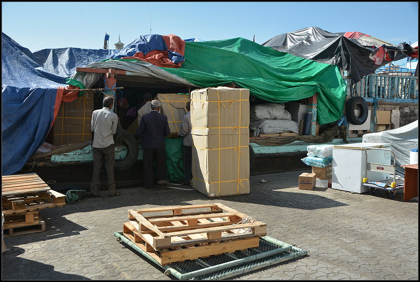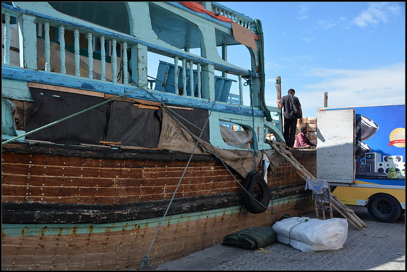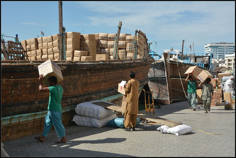Am Dubai Creek, einem natürlichen Meeresarm, spazierten wir eine Weile an den großen bauchigen Holzschiffen, den Dhaus, entlang. Männer waren damit beschäftigt, unzählige große Kisten und dicke Säcke an Bord der traditionellen Handelsschiffe zu schleppen. Auch heute verkehren die alten Boote noch zwischen Dubai und dem Iran, Irak, Pakistan, Sri Lanka und einigen anderen Ländern. Man kann es kaum glauben, so wie die Schiffe aussehen!