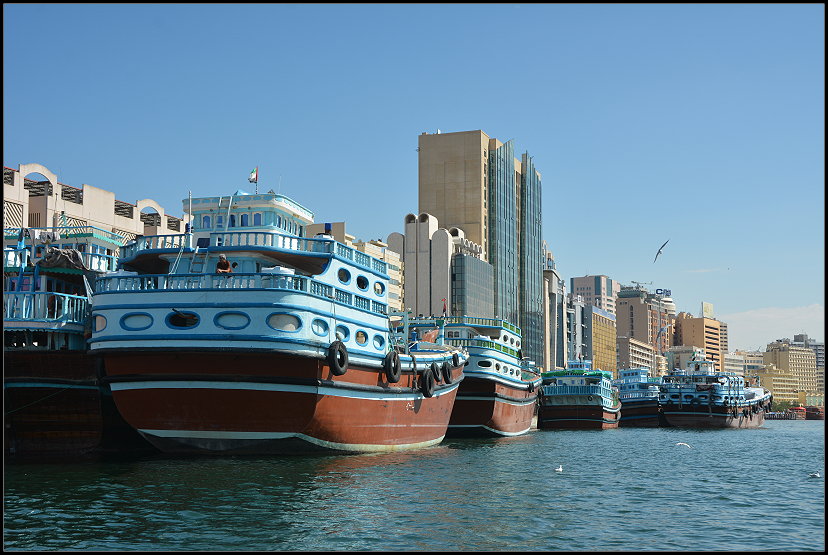 Eine Weile beguckten wir uns das regen Treiben am Ufer und auf dem Wasser. Dabei genossen wir die orientalische Atmosphäre. Das Einzige, was wir dort mit einem modernen und gigantischen Dubai in Verbindung brachten, waren die vollklimatisierten Wartehäuschen der Bushaltestellen am Straßenrand.
