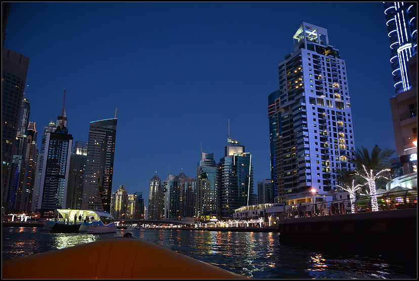 Erst als es dunkel wurde, fuhren wir in die Marina zurück. Vorbei an den beleuchteten Hochhäusern schipperten wir dann wieder langsam über die Wasserstraße.
