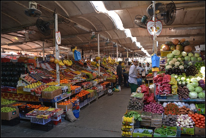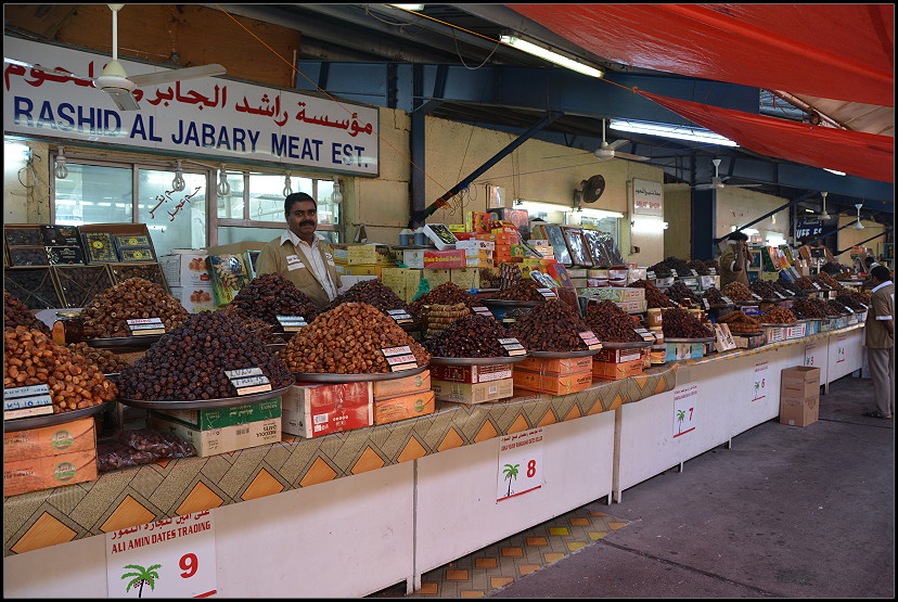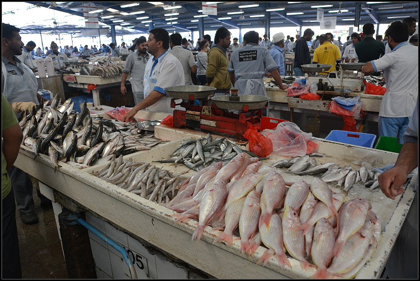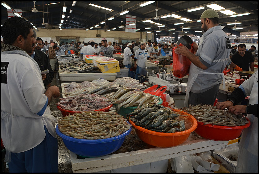 Um 7:00 Uhr war die Nacht wieder rum. Nach dem Frühstück ließen wir uns zum Deira-Fischmarkt bringen. Das bunte Treiben auf solchen Märkten mögen wir sehr. Es gibt eine offene Fischhalle, eine kleine Fleischabteilung und viele bunte, exotische Obst- und Gemüsestände. Die Verkäufer waren alle farblich passend zu ihren Waren „uniformiert“ und überaus freundlich und gar nicht aufdringlich. Es waren so gut wie keine anderen Touristen unterwegs und wir konnten nach Herzenslust fotografieren. Das war ja mal was für mich!