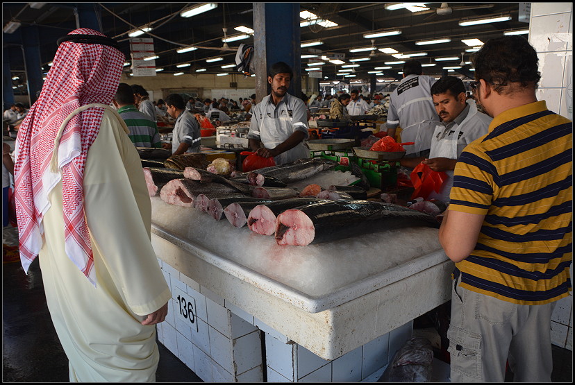 Der Boden war nass vom tauenden Eis und ein lautes Stimmenwirrwarr erfüllte die Luft. Der Geruch dort war erstaunlicherweise erträglich, was wahrscheinlich auch an den fehlenden Hallenwänden und der für Dubai niedrigen Temperatur von 25 °C lag.