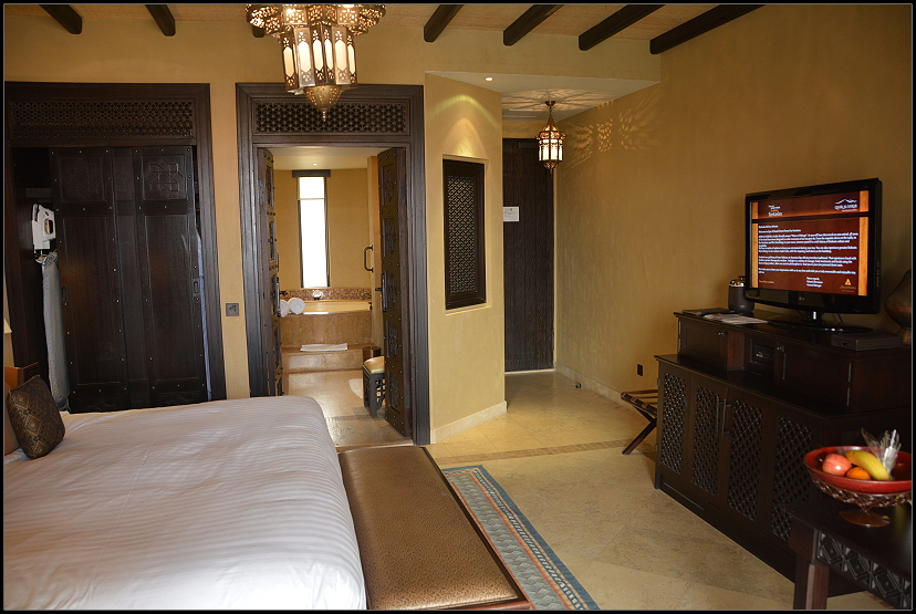 Gegen 21:00 Uhr fuhren wir mit dem Golfcart zurück und wurden sogar bis zum Zimmer gebracht. Toll, einfach toll! In der Zwischenzeit war jemand dort gewesen und hatte die Dekokissen vom Bett genommen, die Decke zurückgeschlagen, uns Wasser auf den Nachttisch gestellt und zwei verpackte Datteln auf die Bettdecke gelegt. Sehr aufmerksam.